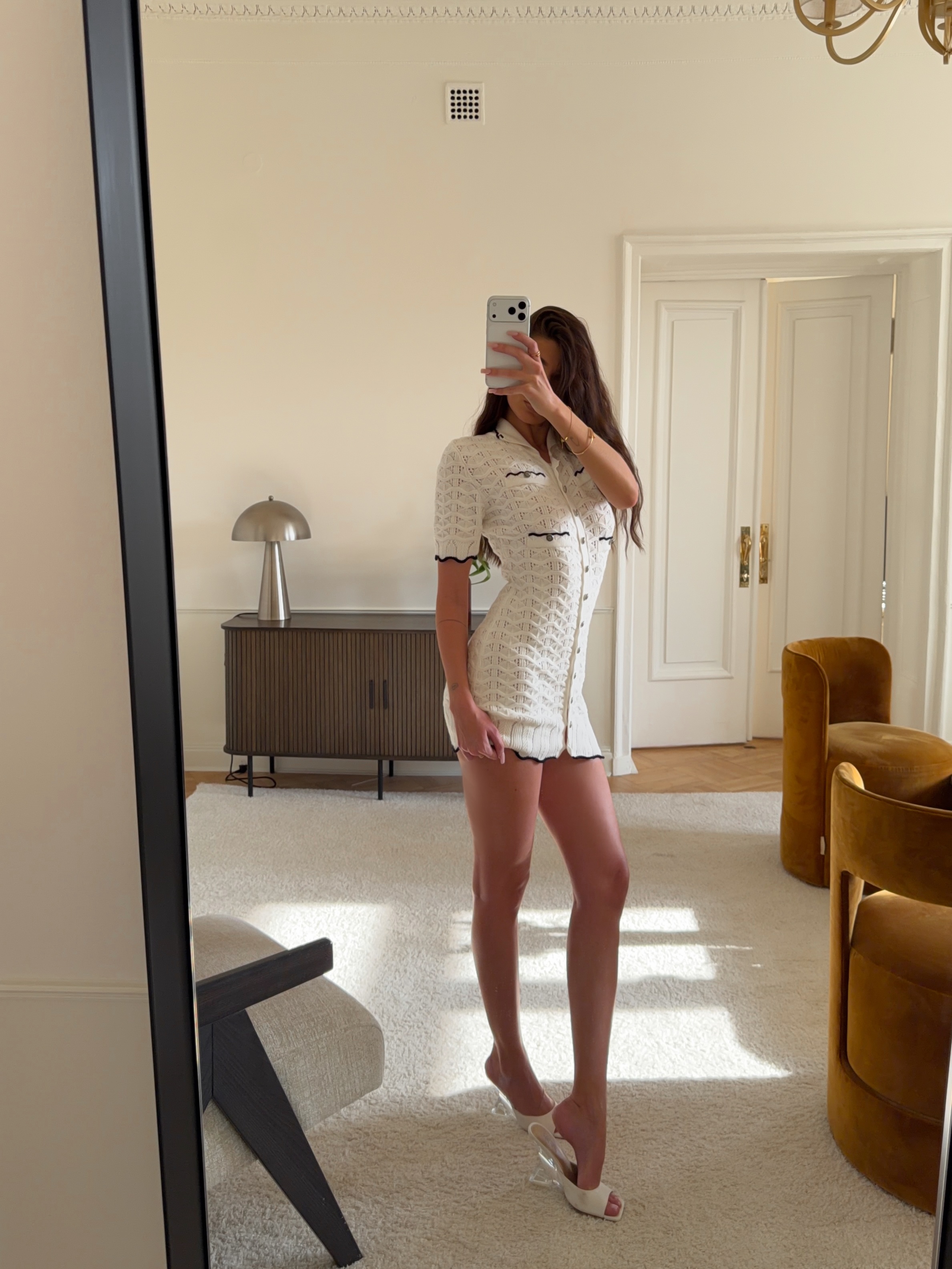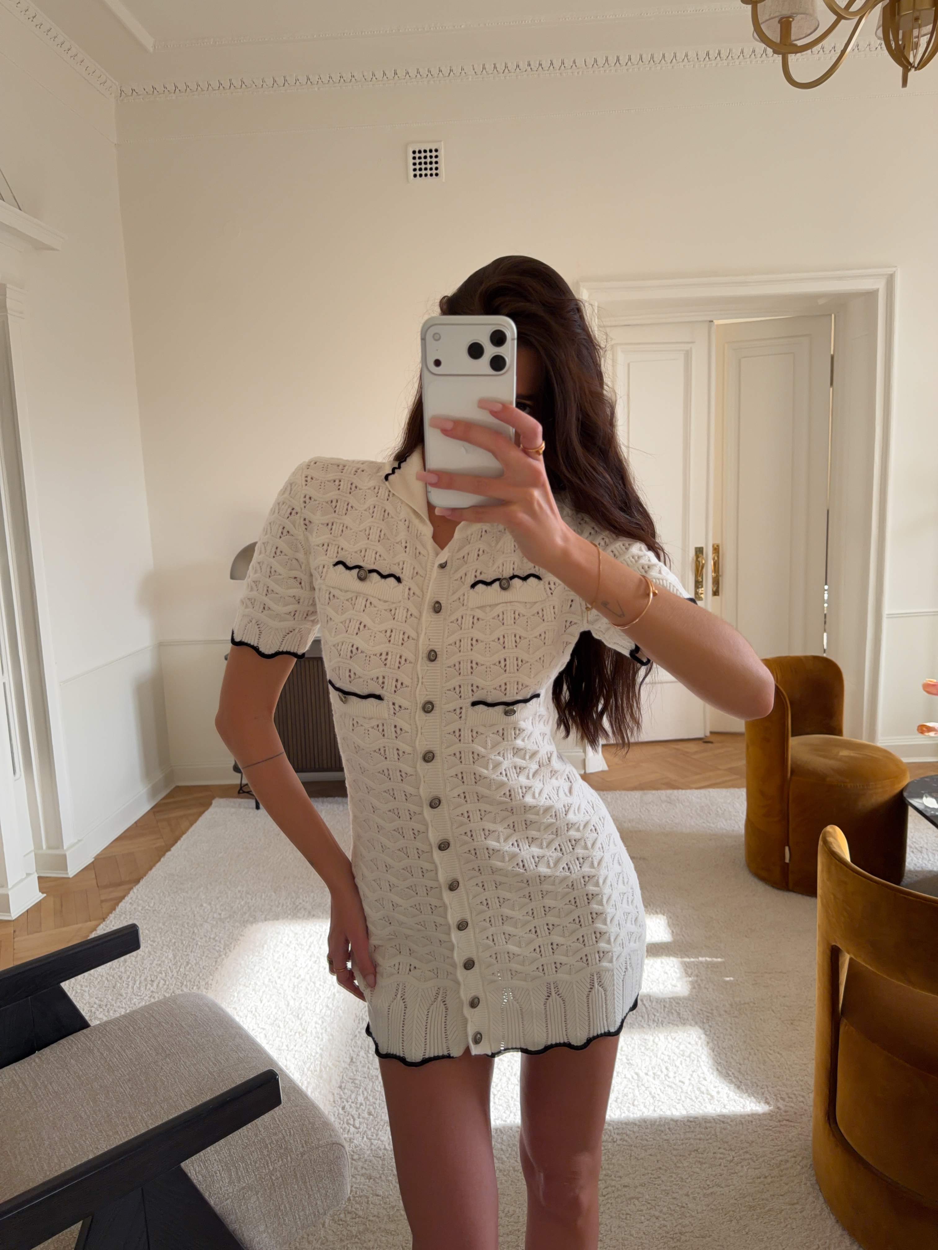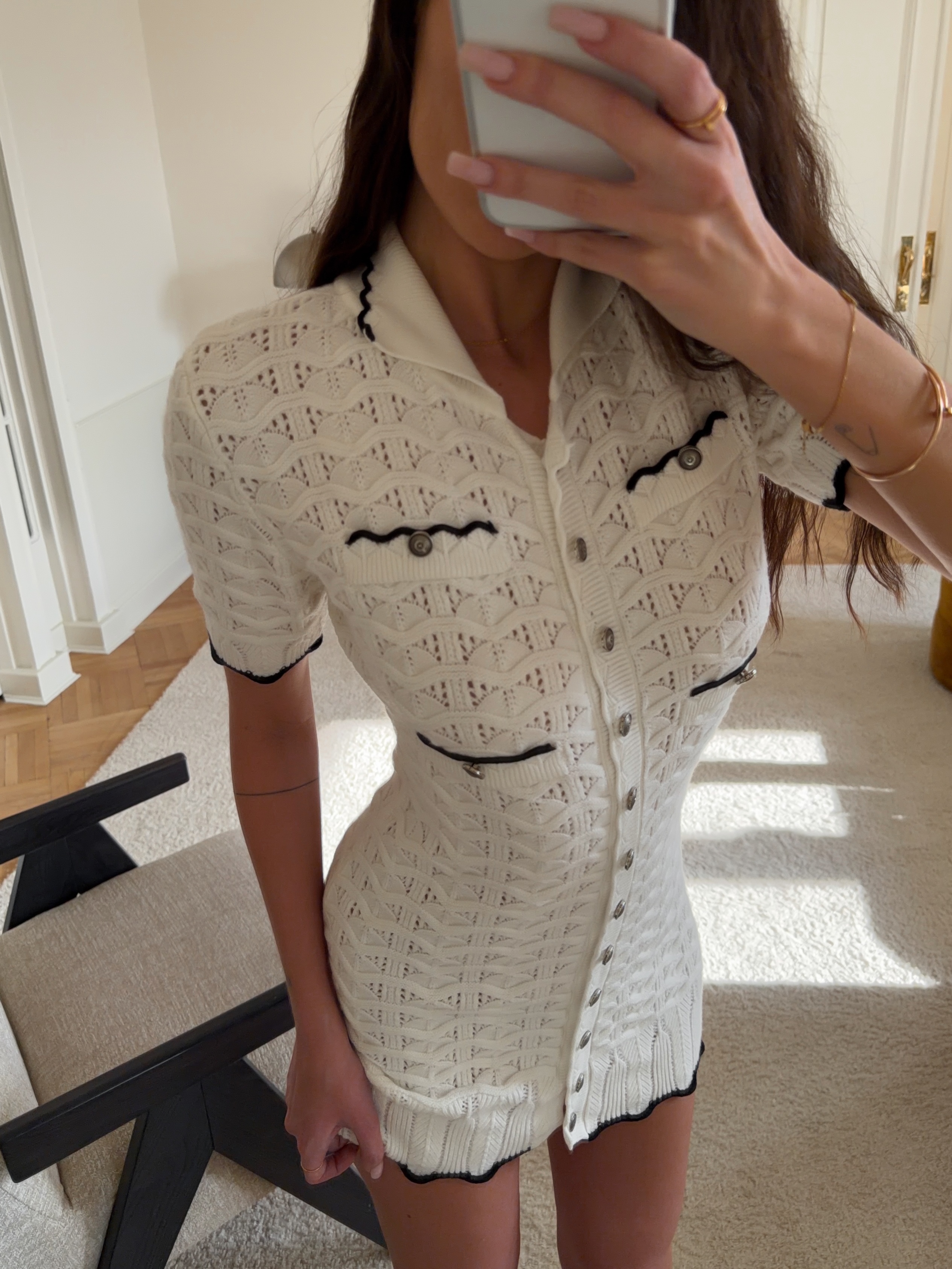 Новый обворожительный образ от YULIA BOGUNOVA. Представьте себе короткое ажурное платье в стиле Шанель, которое сочетает в себе элегантность и комфорт. Его легкая текстура и воздушные узоры создают ощущение утонченности. Короткие рукава добавляют игривости, а передняя застежка на красивые пуговицы придает платью особый шарм.