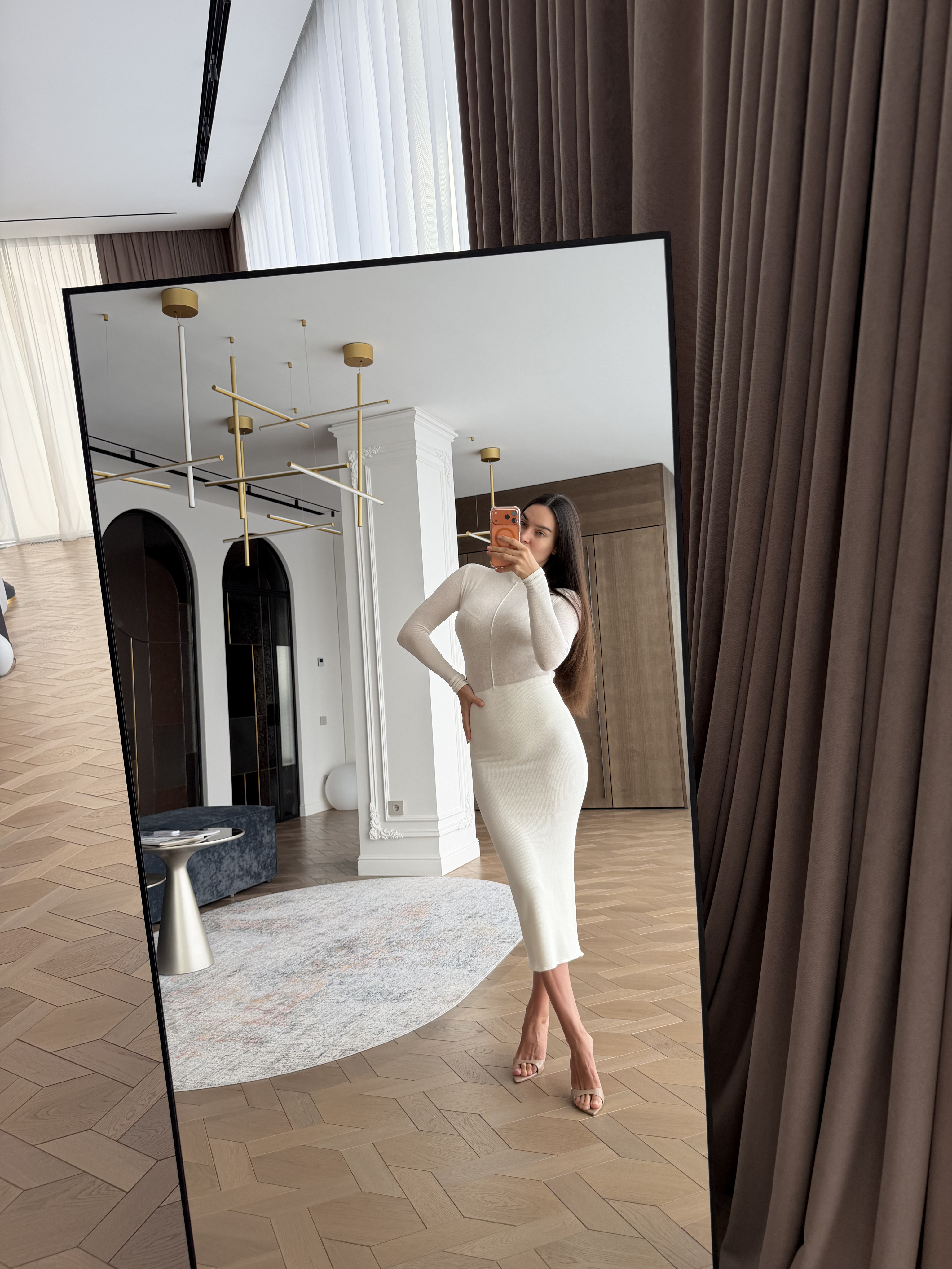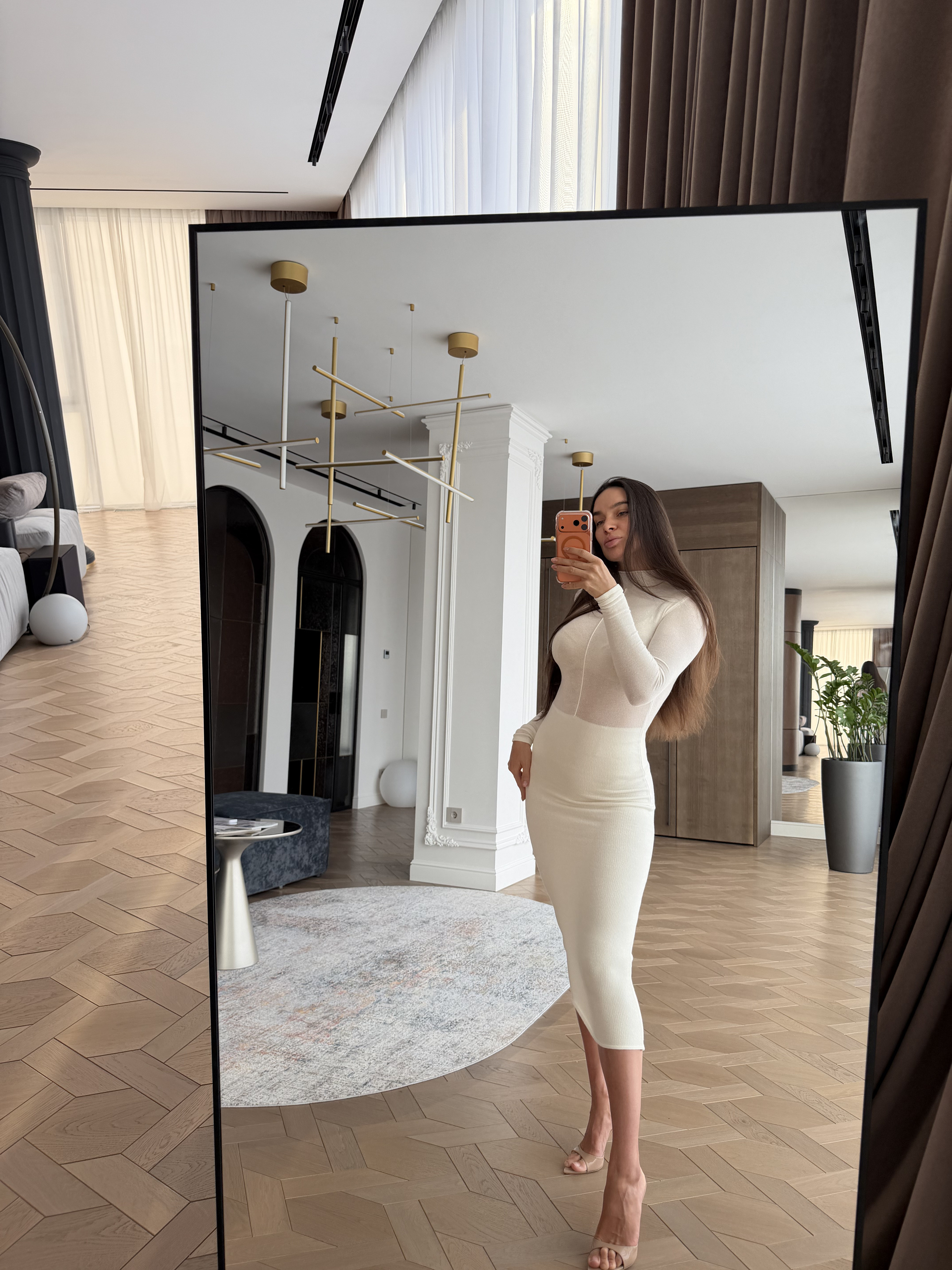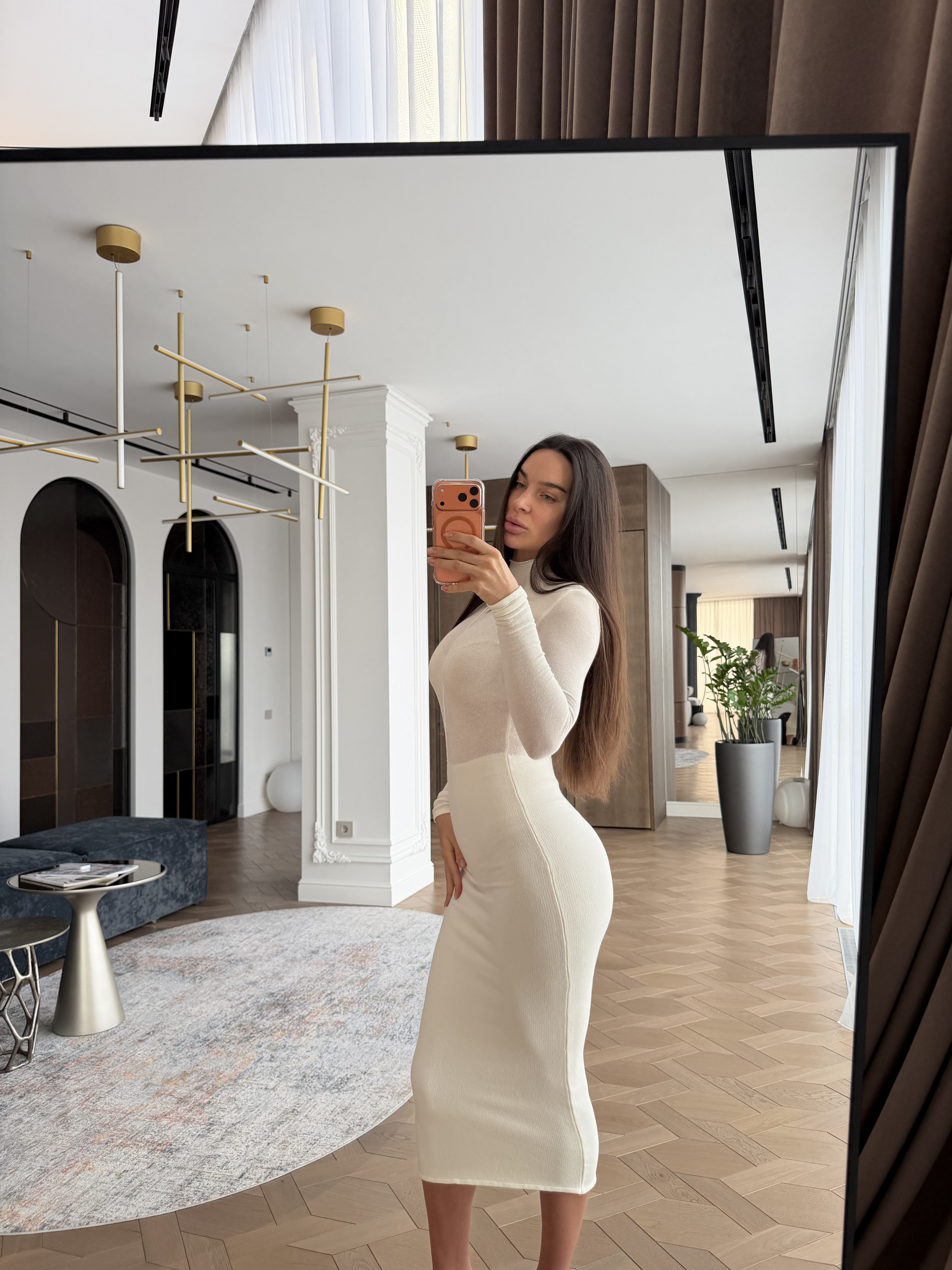 Создавая эту изящную модель, мы сделали акцент на утонченность нежной пряжи, позволяя тонкому полотну играть с прозрачностью, оставляя место для фантазии и соблазна. Платье из премиальной итальянской вискозы средней длины с длинными рукавами и высоким горлом создает утонченный силуэт, подчеркивает достоинства фигуры, а декор в виде среднего шва добавляет интересный акцент. Верхняя часть выполнена из тонкой вискозы, плавно переходящей в плотную юбку, что создает эффект гармоничного сочетания кофты и юбки. Идеально для любого случая — от деловых встреч до эффектных выходов в свет вечером.
